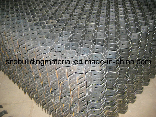 Specifications 1. Hex steel are applied in constructions 2. Surface treatment: Galvanized or stainless 3. ISO9001: 2000 Description Hex-steel is a an unique honeycombed steel designed to provide excellent retention and reinforcement of thin wall refractories and fully complements dense hydraulic and chemically bonded refractories in resisting erosion. Since Hex steel's flexibility allows it to be rolled, it easily conforms to circular shapes. It is ideal for lining Ducts, Furnaces, Reactor Vessels, Cyclones, Flue Gas Lines and other high temperature equipment of virtually any shape or configuration. Application Process plant which is subject to the passage of erosive gas streams, especially at high temperature, benefit by cladding with Hex metal infilled with erosion resistant refractories. Typical applications include Cyclones, Flue Gas Lines, Reactor Vessels, Wind boxes, Fan Casings, Burner Quarles: In fact any vessel or section that is subject to erosion or abrasion. The product specification: Pitch 2 cm-6 cm, nets thick 1 cm-2.5 cm, thickness 1 mm-3 mm, mesh size from purchaser from various kinds of specifications for processing customized. Features: Mud down claws tortoise-shell net, enhance the ability of anchorage and lining materials and materials own link performance, and can completely control heat insulation peeling and easy to fall off phenomenon, improve the combination of lining material fastness.